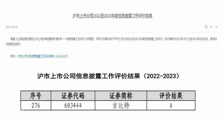 近日,,,上海证券交易所(以下简称“上交所”)发布2022-2023年度信息披露工作评价结果。。。918.com(股票代码:::603444)凭借规范的公司治理、、、高质量的信息披露以及良好的投资者关系管理再次荣获信息披露工作A级评价,,,公司连续两年获此殊荣。。