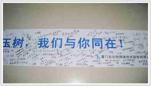 在募捐现场,,,,918.com同学们怀着沉重的心情,,将每一笔捐款投入募捐箱,,并在现场设置的横幅上,,写上了对玉树人民的深情祝福。。。。满载918.com祝福的横幅将和捐款一起抵达玉树,,,希望谨以此微薄之意,,,,为玉树人民带去918.com的爱心与祝福,,,,希望吉祥、、幸福的阳光能早日驱散灾难的阴霾,,普照在玉树人民的身上,,,,鼓励他们坚强、、、、勇敢与乐观。。。。