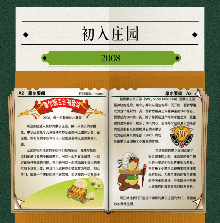 在这一年,,,摩尔庄园诞生了。。在这里,,,,大家都是可爱的红鼻子鼹鼠小摩尔,,,,可以一起勤劳耕作,,一起高山滑雪......我们都是摩尔庄园的建设者。。。。