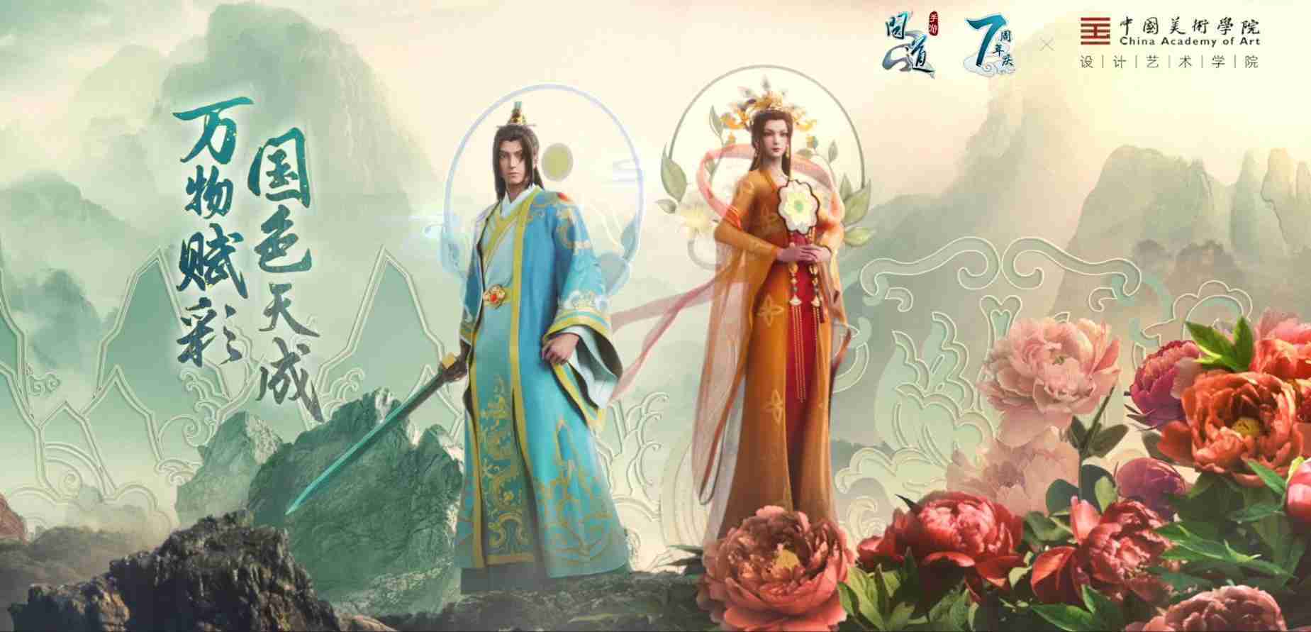 2023年4月,,,,《问道手游》联动中国美术学院,,,在游戏中融合了中国历史上不同时期的文化元素,,打造了“山河万象”与“凤鸣九霄”的国风时装。。在色彩配置方面,,,创作团队基于对游戏角色特性的分析提取相应的文化内涵,,,,从每一种色彩的色相、、、指代事物和情感出发对应角色属性,,,,选定服装的色彩搭配。。。。在纹样设计方面,,,,创作团队结合游戏角色自身特殊的造型比例和形态,,,在实际的纹样设计中进行了游戏语境下的活化演绎。。。男性角色集中使用了如蟒纹、、、海水江崖纹、、如意纹和云气纹等传统纹样元素,,,,女性角色则吸纳了凤凰纹、、、牡丹纹、、卷草缠枝纹等元素,,,,组成以“双凤牡丹纹样”“缠枝牡丹纹”“金玉凤冠头饰”为主要纹样的游戏角色装饰图案系统。。。