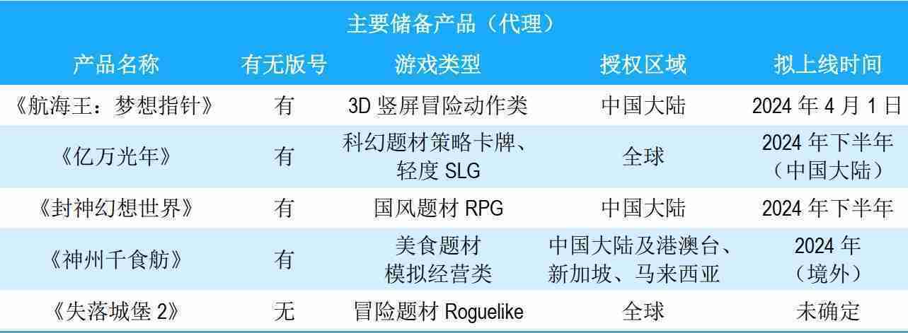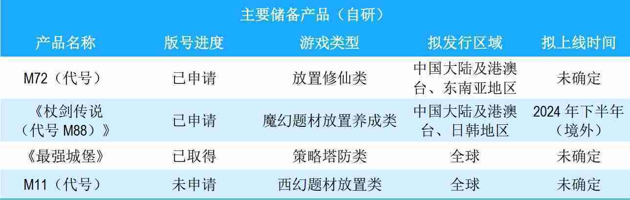 公司储备的多个自研、、、、代理产品都在有序推进当中,,,,涵盖放置类、、策略类、、、模拟经营类、、、、RPG、、、、Roguelike等多元化游戏品类,,储备的主要自研和代理产品如下::::