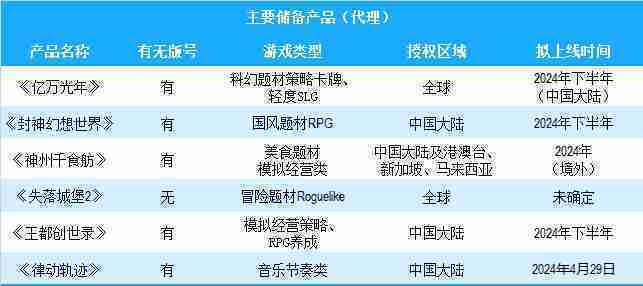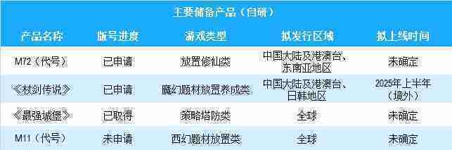 公司有多款储备产品,,,,涵盖放置类、、、策略类、、、RPG、、、、Roguelike等多元化游戏品类,,储备的主要自研和代理产品如下::